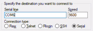 Afterwards, open up PuTTY and configure it to use that COMX port, as Serial, at 9600 baudrate: