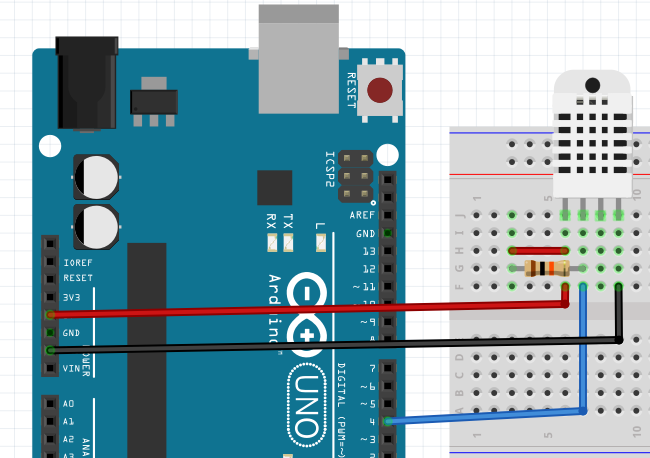 Let’s plug it in to our Arduino board. It is powered with 5V, and requires a single dignal pin connected to any digital GPIO, let’s use pin number 4 as an example. Please note the pull-up resistor required on the data pin.
