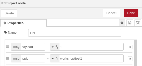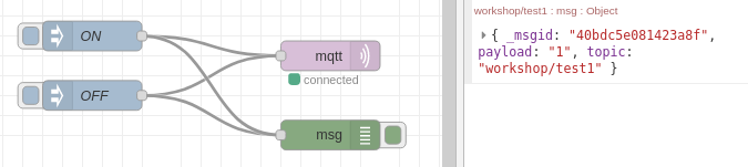 Another useful block is the ‘inject’ block that enables you to manually inject a message into the system. For example you could manually control the LED from the cloud.
